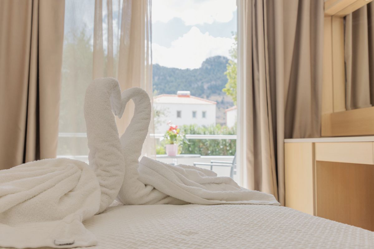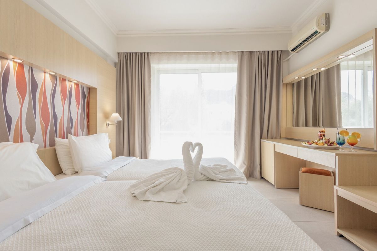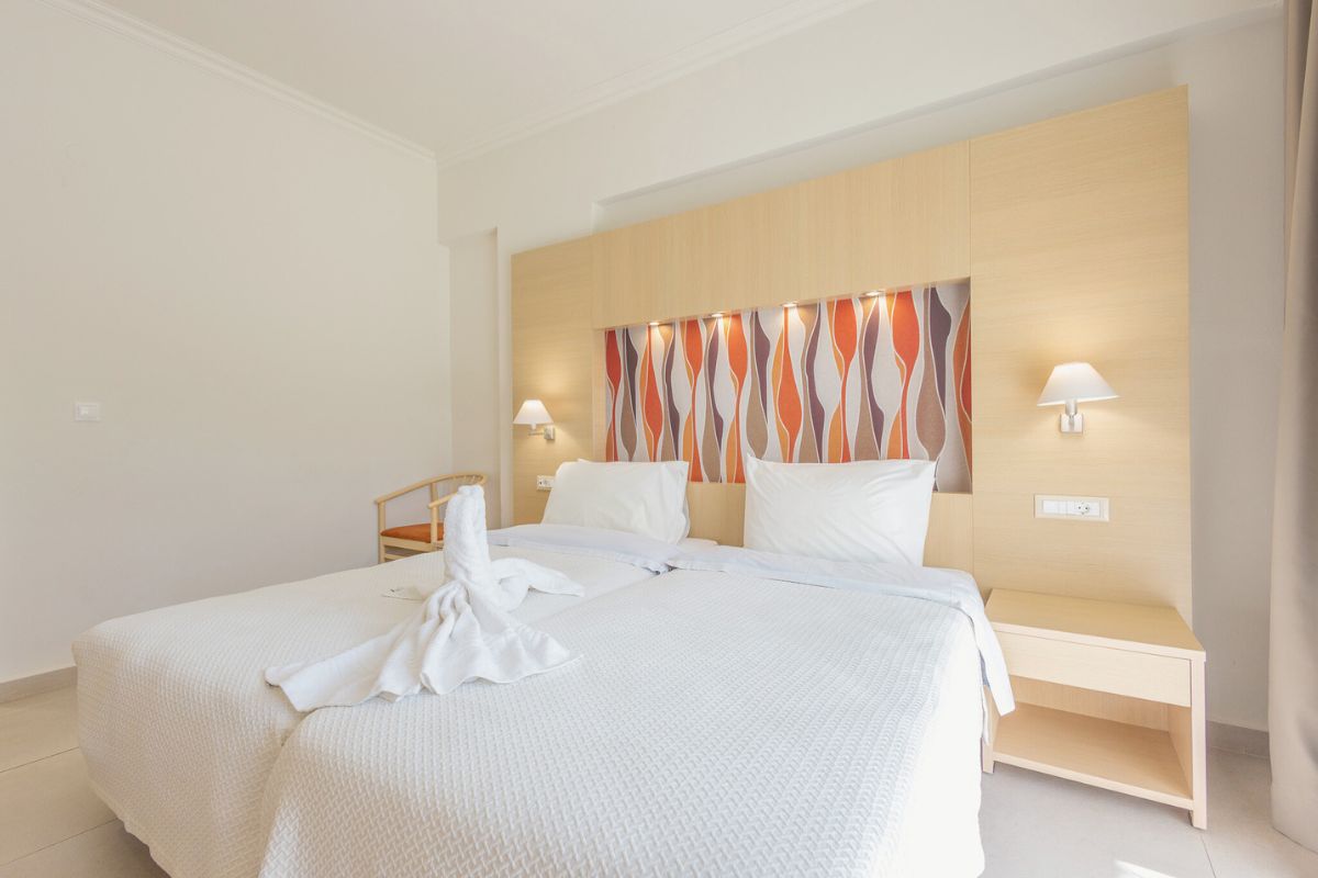 The standard sea view double rooms are allocated throughout the second, third and fourth floor. The 24 square meters rooms can host up to 2 persons in a double or two single beds and they are allocated on all floors with views over Elli Beach that guarantee an unforgettable stay during your summer holidays.