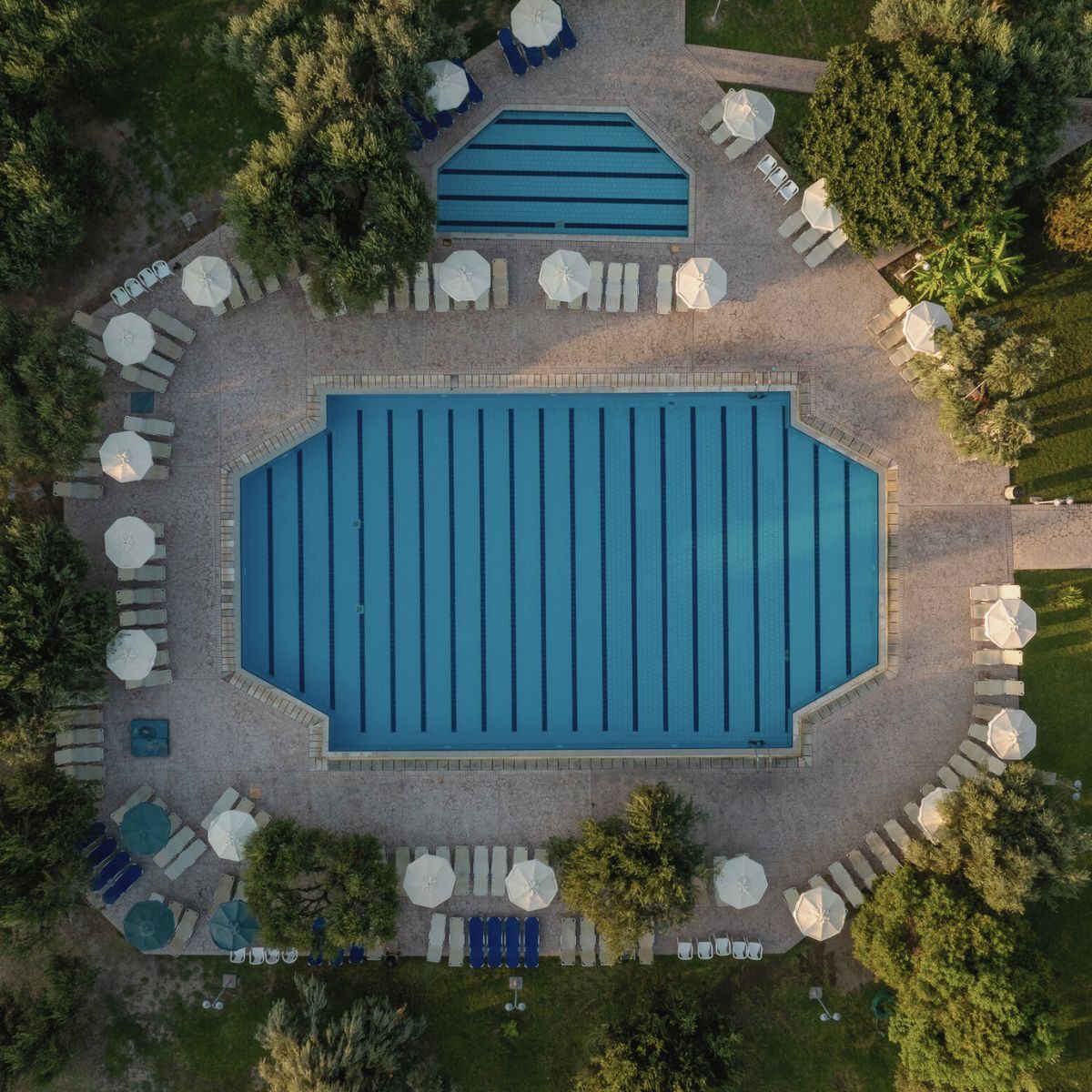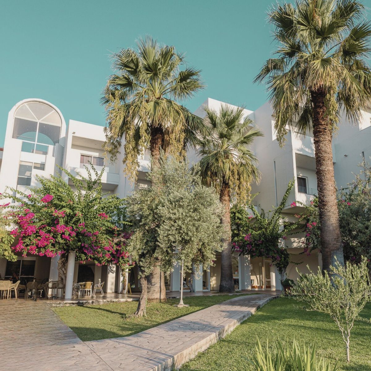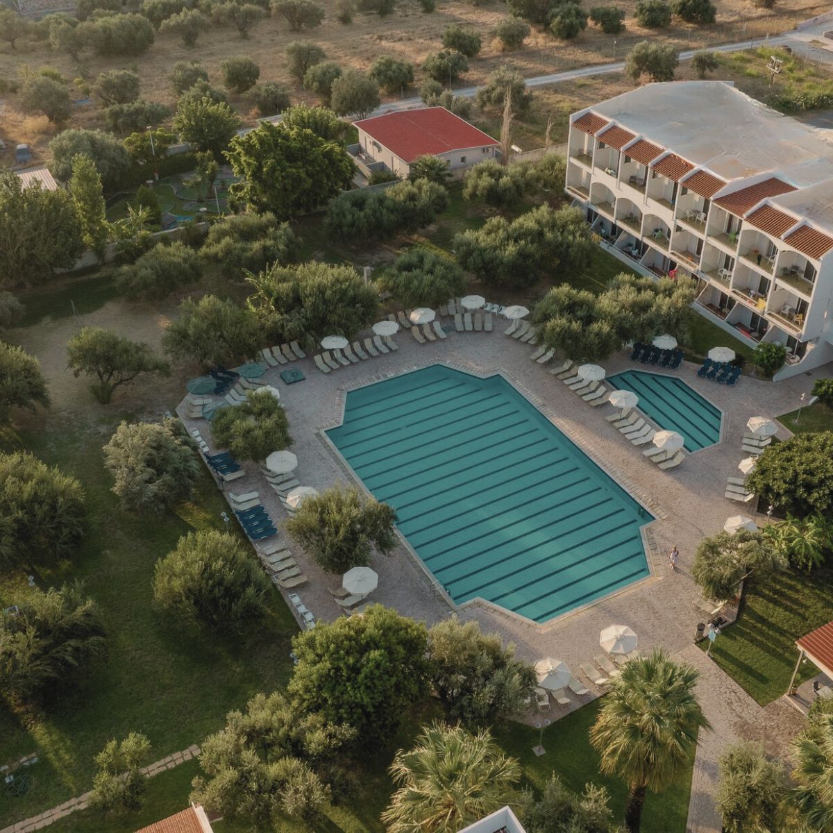 At the heart of the property lies a Mediterranean garden filled with olive trees, palm trees, and bougainvillea. It creates a refreshing backdrop where the sounds of summer — cicadas in the afternoon, the sea breeze at dusk, the quiet rhythm of Greek island life — frame every moment of your stay. Within this setting, guests enjoy spacious rooms and suites, a large swimming pool with a children’s section, and an all-inclusive service that brings together Greek and Mediterranean flavors with international favorites, available throughout the day.